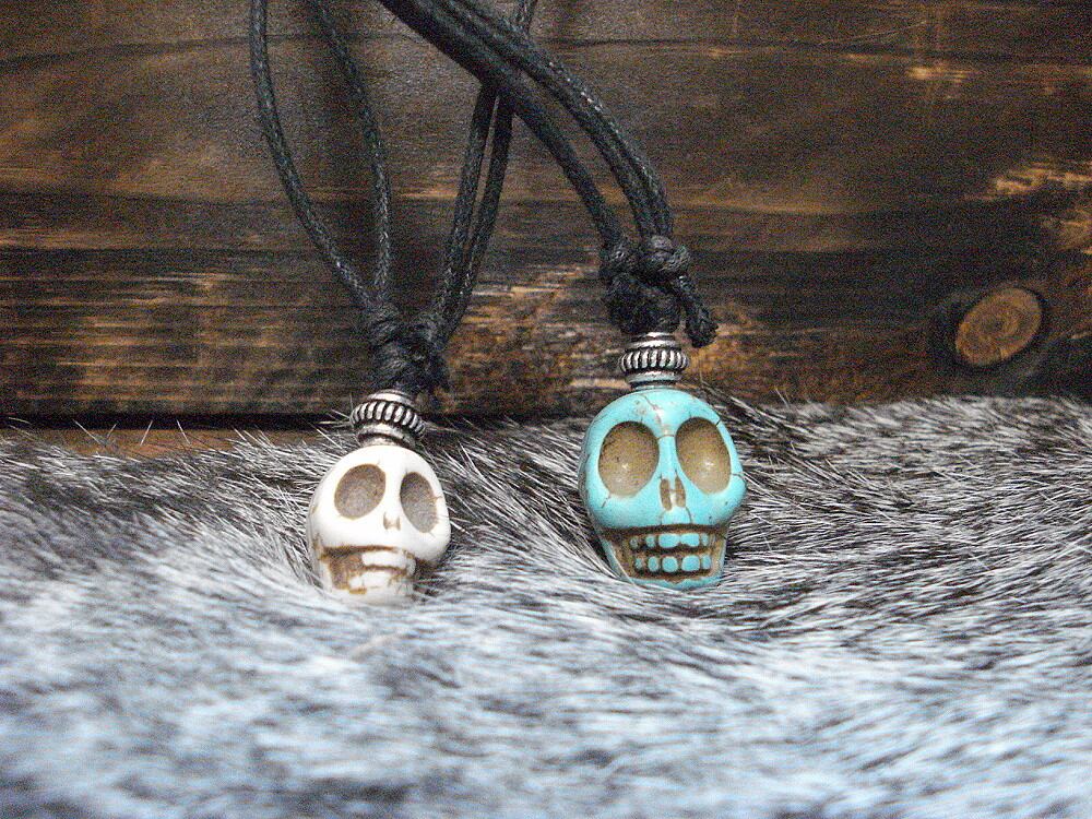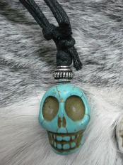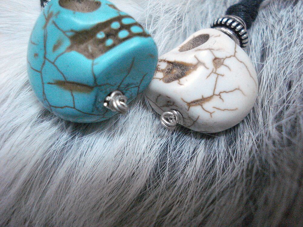 化石っぽい雰囲気に仕上がっている髑髏。紐は調節可能(ぶきっちょサンは器用な人にやってもらって下さい)、髑髏の顎下にポチがついているので更にビーズつけたりしてカスタマイズして頂けます。